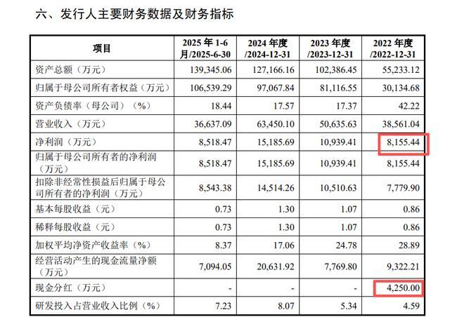 财务数据显示,2022年—2024年以及2025年上半年(以下简称“报告期”),公司实现营业收入分别约为3.86亿元、5.06亿元、6.35亿元及3.66亿元;对应实现归属净利润分别约为8162.16万元、1.08亿元、1.52亿元及8619.6万元。