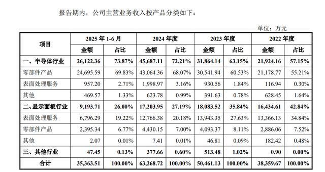 公司主要产品为硅、石英、碳化硅和氧化铝陶瓷等设备零部件产品,以及熔射再生、阳极氧化和精密清洗等表面处理服务。