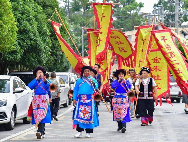 村民们身着民族服装,组成特色方阵,沿街表演、巡游。