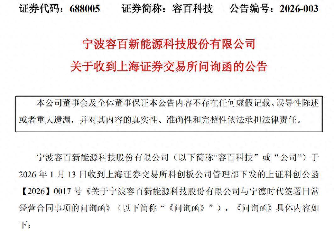 容百科技(688005)刚披露与宁德时代签署总金额超1200亿元大订单,上交所1月13日晚火速向其下发问询函,要求说明公司是否具备相应履约能力配资论坛app下载,是否存在借大额合同进行股价炒作的动机。