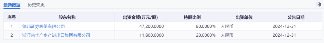 德邦基金的股东包括德邦证券(603056.SH)和浙江省土产畜产进出口集团有限公司,分别持股80%、20%,属于券商类公募公司。
