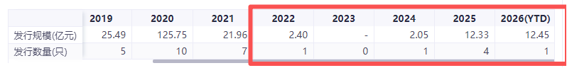 在发行规模上,2025年、今年至今,虽然发行规模超12亿元,但与2020年发行高峰时期的约126亿元相差甚远,不及十分之一。
